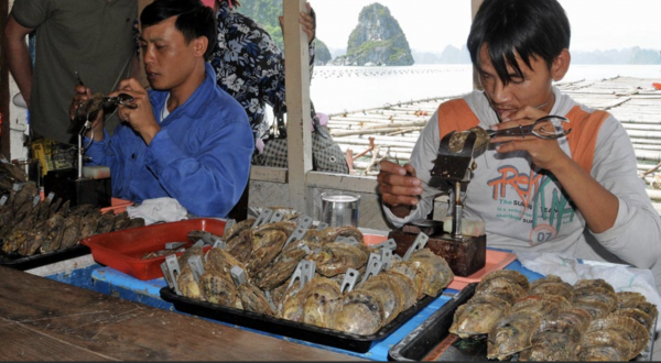 The number of blemishes on a pearl’s surface is evaluated to judge quality.